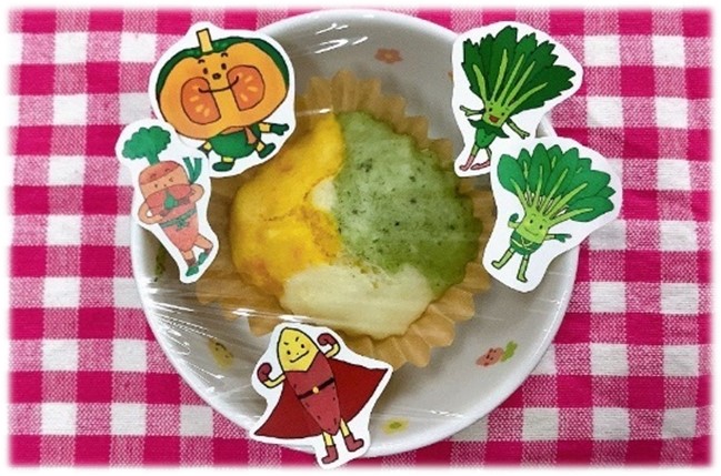 ▲5種類の野菜を使った蒸しパン。どの色が何の野菜かな?おまけシールを子どもたちにプレゼントすると大喜び!