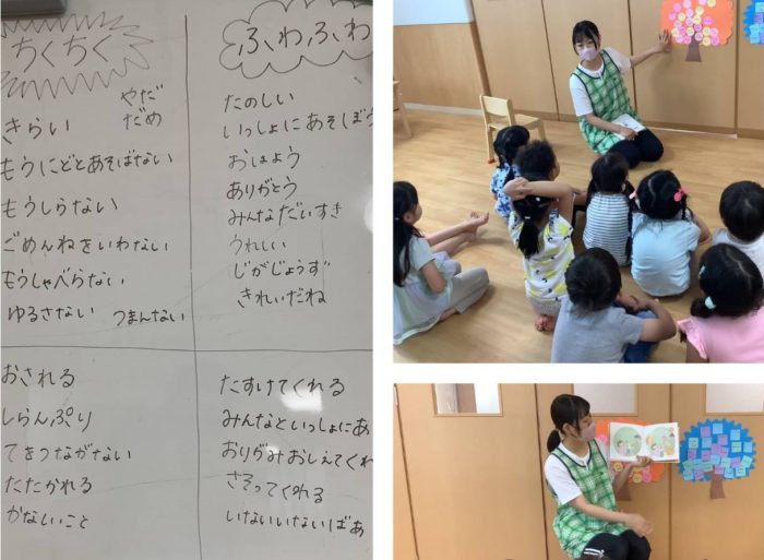 言葉を大切にすることを目的に制定された「ことばの日」。 5歳児クラスでは、友達との会話を振り返りながら「どんな言葉を言われたら心がふわふわ・ちくちくするか」を話し合いました。言葉について考えることで、人の気持ちも考えられる貴重な時間になりました。